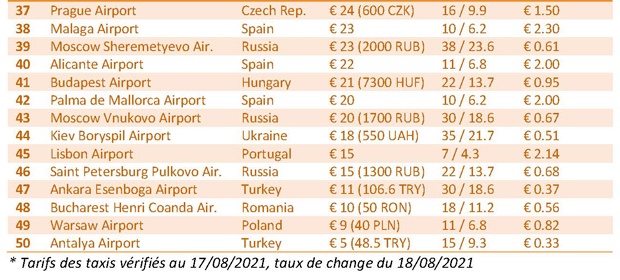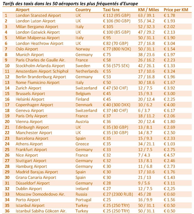 AirMundo.com, site d’information sur les aéroports, compare régulièrement les tarifs des taxis dans les 50 aéroports les plus fréquentés d’Europe. Les comparaisons sont faites sur la base à la fois du prix du trajet en taxi et du prix au kilomètre.