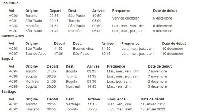 Air Canada confirme par la même occasion son intention de rétablir sa desserte de Buenos Aires en Argentine à partir de Toronto et de Montréal, via São Paulo. Les vols pour l’Argentine, qui a annoncé la réouverture de ses frontières aux touristes internationaux le 1er novembre, sont en attente de l’approbation des autorités. Une autre destination clé d’Amérique du Sud s’ajoutera au réseau d’Air Canada en janvier 2022 avec la reprise du service entre Toronto et Santiago, au Chili, à raison de trois vols par semaine.