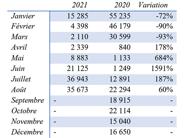 La ministre du Tourisme en charge des transports internationaux est d’autre part revenue sur la saison estivale écoulée, marquée par une reprise du trafic de passagers internationaux (commerciaux) durant les mois de mai à juillet 2021 (avec des volumes supérieurs à 2020). Cependant, précise le communiqué du conseil des ministres, l’apparition du variant Delta en Polynésie française durant les mois de juillet et août a provoqué un « tassement de la demande ». Avec la levée des restrictions et l’amélioration sanitaire, l’activité aérienne, en volume, est à la hausse.