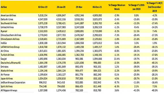 Si de nombreux gouvernements ont annoncé de nouvelles mesures sanitaires après l’identification en Afrique du Sud du nouveau variant, y compris en France, les effets ne sont pas fait ressentir immédiatement sur le trafic aérien. Selon l’étude d’OAG sur la première semaine de décembre 2021, la capacité mondiale à 78,3 millions de sièges était en baisse d’un demi-point de pourcentage ; une constatation qui pourrait bien sûr évoluer en fonction des annonces de nouvelles restrictions, mais jusque là les compagnies aériennes « n’ont pas paniqué ».