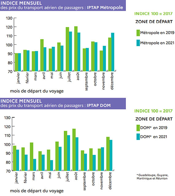 Sur le réseau intérieur, les prix des billets sur les liaisons intra-métropolitaines diminuent de 2,5% par rapport à décembre 2019 (+2,5% au cumul). Globalement, les prix reculent aussi vers l’outre-mer, avec une baisse de 5,5% par rapport à décembre 2019 (-7,1% au cumul). Dans le détail, seuls les prix vers la Guyane augmentent, « quoique faiblement ». Les prix vers l’océan indien sont, comme tout au long de l’année 2021, en baisse ; de même, les tarifs vers les Antilles reculent, particulièrement à destination de la Martinique.