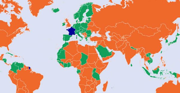 En Afrique s’y ajoutent le Cap Vert, la Côte d’Ivoire, le Gabon, le Ghana, la Guinée, la Guinée équatoriale, la Guinée Bissau, l’Île Maurice, le Maroc, la Mauritanie, l’Ouganda, la Tanzanie, le Tchad et le Togo.
