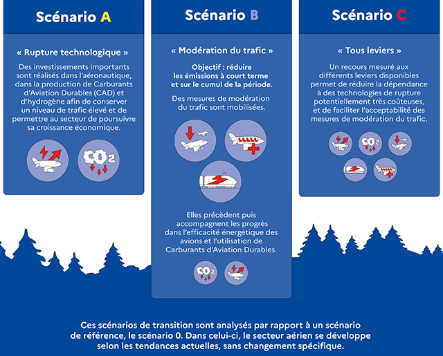 Scénario A : « Rupture technologique ». Des investissements importants sont réalisés dans la recherche et la construction aéronautique (avion à hydrogène notamment) ainsi que dans la production de Carburants d’Aviation Durables (SAF), afin de conserver une croissance du trafic aérien.