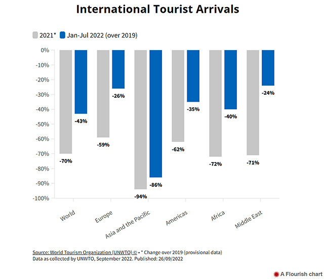 Selon le dernier numéro du Baromètre OMT du tourisme mondial, les arrivées de touristes internationaux ont « presque triplé de janvier à juillet 2022 » (+172 %) par rapport à la même période en 2021, le secteur retrouvant près de 60 % de son niveau d’avant la pandémie. Ce « redressement vigoureux » est le résultat d’une forte demande refoulée de voyages internationaux, ainsi que de l’assouplissement ou de la levée des restrictions sur les voyages : au 19 septembre 2022, 86 pays n’avaient aucune restriction sanitaire.