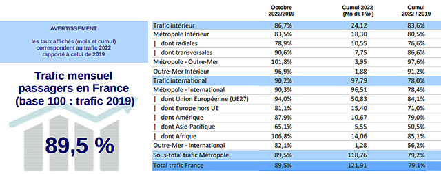 Le trafic international atteint 90,2% de celui d’octobre 2019, soit une valeur « supérieure de 4 à 5 points à celles enregistrées les trois derniers mois ». L’Afrique en particulier affiche 106,8% du niveau du même mois en 2019. En cumul annuel, son taux résiduel se chiffre globalement à 78,0%, dont « pour la première fois un taux vers l’Asie supérieur à 50%, avec toutefois d’importants contrastes selon les destinations ».