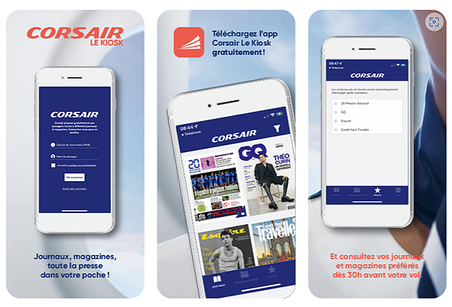 Depuis début janvier 2023, les clients de la compagnie aérienne Corsair International peuvent consulter leurs journaux et magazines favoris à bord gratuitement et en illimité, sur la nouvelle application Corsair Le Kiosk.