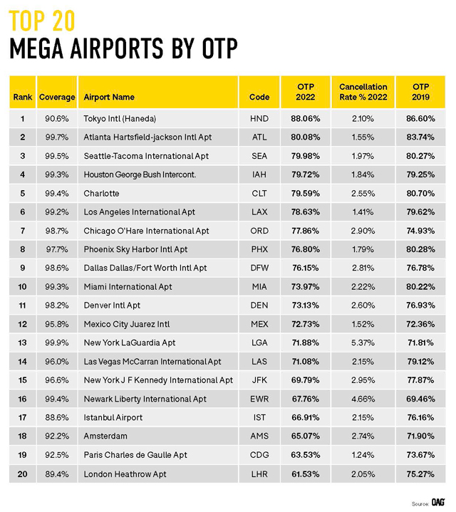 Parmi les 20 meilleurs méga-aéroports du monde, Tokyo-Haneda a pris la première place (OTP 88,06 %), suivi par une longue liste d’aéroports des Etats-Unis. L’OTP des grands aéroports d’Europe a été affectée par les problèmes de ressources opérationnelles rencontrés pendant la période estivale, principalement en raison du manque de personnel. En conséquence, les premiers hubs européens (Amsterdam, Paris-CDG et Londres-Heathrow) sont à la queue du TOP 20.
