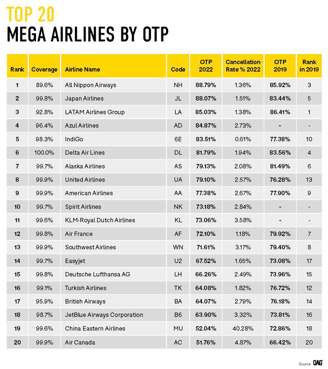 Parmi les 20 meilleures des grandes compagnies aériennes du monde, le Japon occupe la première place avec All Nippon Airways, classée première avec une performance de ponctualité (OTP, on-time performance) de 88,79 %, suivie de Japan Airlines (OTP 88,07 %). LATAM Airlines (OTP 85,03 %) se classe en troisième position, Azul Airlines (OTP 84,87 %) en quatrième position et IndiGo en cinquième position (OTP 83,51%).