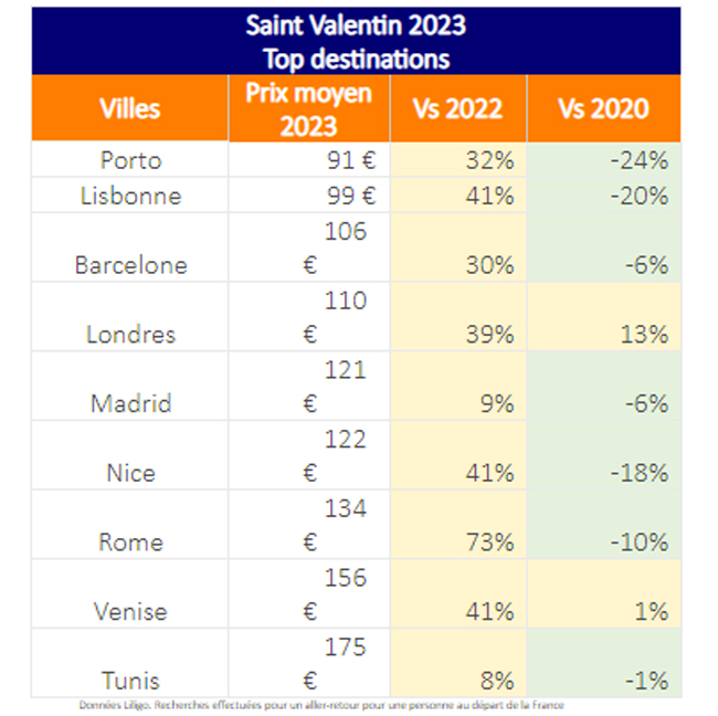 « Comme les précédentes Saint-Valentin, le Portugal est très souvent plébiscité pour ses températures clémentes et sa proximité. Cette année, c’est Porto qui monte à la première marche du podium des destinations les moins chères. C’est le bon plan de la Saint-Valentin à saisir cette année. Les amoureux peuvent également profiter de la capitale Portugaise pour un billet d’avion coûtant en moyenne 99 euros aller-retour », décrit Guillaume Rostand, porte-parole de Liligo.