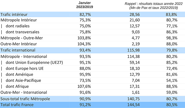 Le trafic intérieur s’établit en janvier 2023 à 82,7% de celui de 2019. Le différentiel de récupération entre les segments incluant les Outre-mer (104,0%) et ceux limités au seul trafic domestique en Métropole (75,3%) « reste très marqué ». Les compagnies aérienne reliant la Métropole à l’Outre-mer affichent un trafic à 103,8% de celui de janvier 2019, et à l’intérieur des DOM TOM ce trafic atteint même 104,3% de celui enregistré le même mois en 2019.