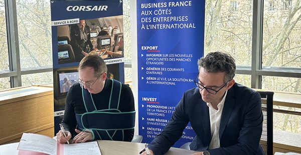 Le vendredi 31 mars 2023, Julien Houdebine, directeur commercial et réseau chez Corsair et Didier Boulogne, Directeur Général délégué à l’export de Business France, ont signé pour la deuxième année consécutive le partenariat ayant pour objectif « d’accompagner les entreprises françaises à l’export à l’international, notamment en Afrique, dans le cadre de missions ». Corsair a ainsi développé une offre spécifique aux entreprises accompagnées par Business France « via des tarifs remisés, des accès salon et des avantages sur la carte de fidélité ».