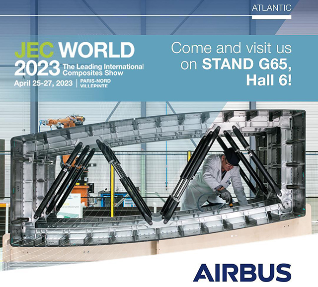 Se tenant du 25 au 27 avril 2023 au Parc des Expositions Paris Nord –Villepinte, le JEC World 2023 accueillera l’ensemble de la communauté internationale du secteur, et pour la première fois Airbus Atlantic, sur le stand G65 – hall 6. Qui y présentera Atlantic 2 démonstrateurs pour l’avion du futur : une nouvelle génération de panneaux de fuselage arrière pour l’A220, fabriqués sur le site de Salaunes (ces panneaux de nouvelle génération en fibre de carbone haute performance et résine époxyde pré-imprégnée offrent un gain de poids significatif et une meilleure résistance à la corrosion tout en permettant d’allonger la durée entre les inspections).