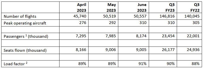 - Rendement revenus annexes par passager : +20% par rapport à l’année précédente (+87% vs T3 de l’année fiscale 2019)
