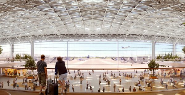 D’après les plans des cabinets britanniques, la pièce maîtresse de l’échangeur multimodal est un atrium, reliant de manière transparente le terminal de l’aéroport, la gare et les autres modes de transport sous une verrière singulière et unificatrice. L’atrium sera le « premier plan de l’aéroport », le lien entre le terminal et la gare, un espace accessible où tous les passagers se rencontrent, quel que soit le mode de transport qu’ils utilisent.