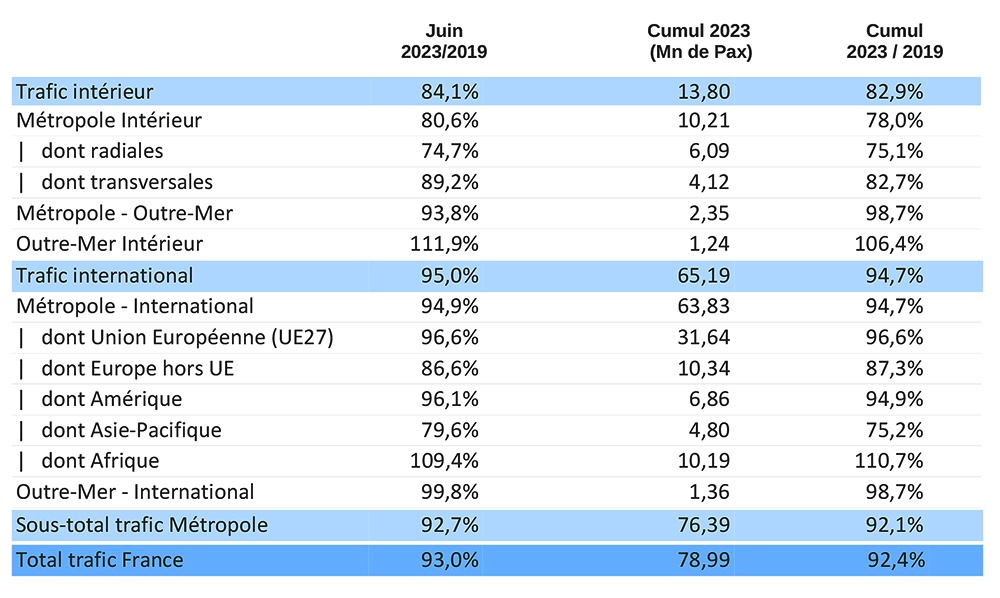 En juin 2023, l’indice Tendanciel de la Direction générale de l’aviation civile française affiche un trafic intérieur dans les aéroports français qui s’élève à 84,1% de son niveau de juin 2019. La reprise reste plus faible sur les liaisons domestiques en Métropole (80,6%) et plus particulièrement sur les liaisons radiales (74,7%). Constats qui se vérifient également selon la DGAC sur l’ensemble du semestre, alors que les segments touchant les Outre-Mer ont de leur côté dépassé leur niveau de fréquentation de 2019 (101,2%).