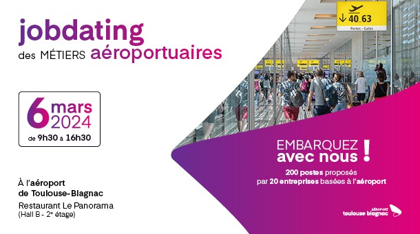 Ce mercredi 6 mars aura lieu la deuxième édition du jobdating des métiers aéroportuaires au restaurant Le Panorama (Hall B – 2e étage) de l’aéroport de Toulouse-Blagnac.