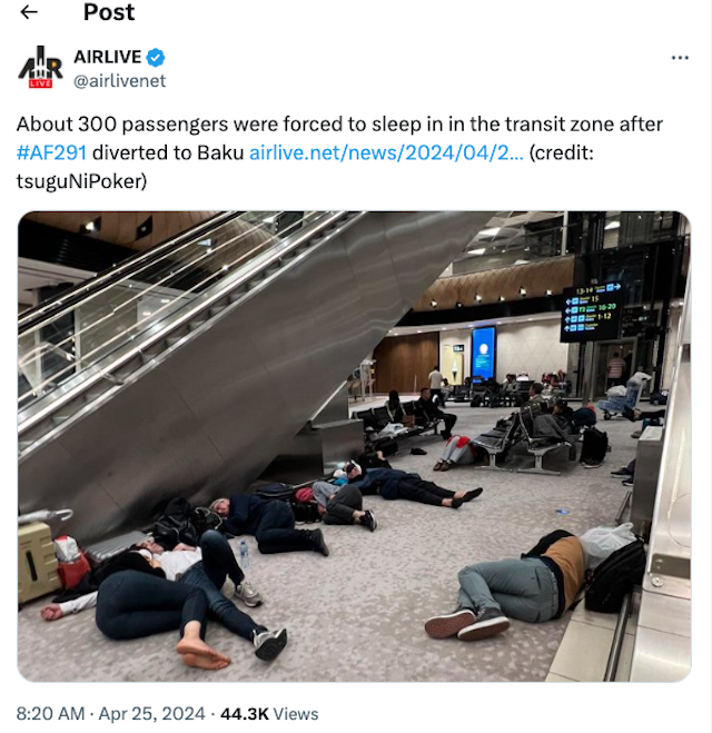 Très drôle sauf que Bakou n est pas une escale d air France et qu il n y a donc pas de personnel au sol pour prendre en charge les passagers