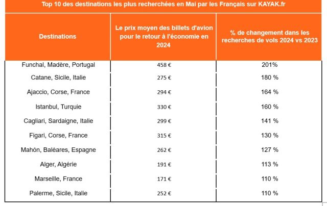 Le mois de mai est également la période idéale pour profiter de la Corse, l’île de beauté, ou de la cité phocéenne de Marseille. Ajaccio se classe au 3e rang des destinations aériennes les plus recherchées, avec une augmentation de 164 % des recherches et un coût moyen de 294 € pour un vol aller-retour. Figari, plus au sud de la Corse, a connu une augmentation de 130 % des recherches, pour un coût moyen de 315 € pour un vol aller-retour. Enfin, Marseille continue d’être la destination préférée des Français, représentant le compromis parfait entre l’émulsion de la ville et l’accès facile aux plages, avec une augmentation de 110 % des recherches.