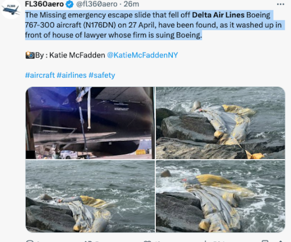 Assez cocasse le commentaire sur X, selon lequel le toboggan a atterri “en face de la maison d’un avocat dont le cabinet poursuit Boeing” (même s’ils doivent être un certain nombre de “lawyers” au vu du nombre de dossiers et de personnes concernées)