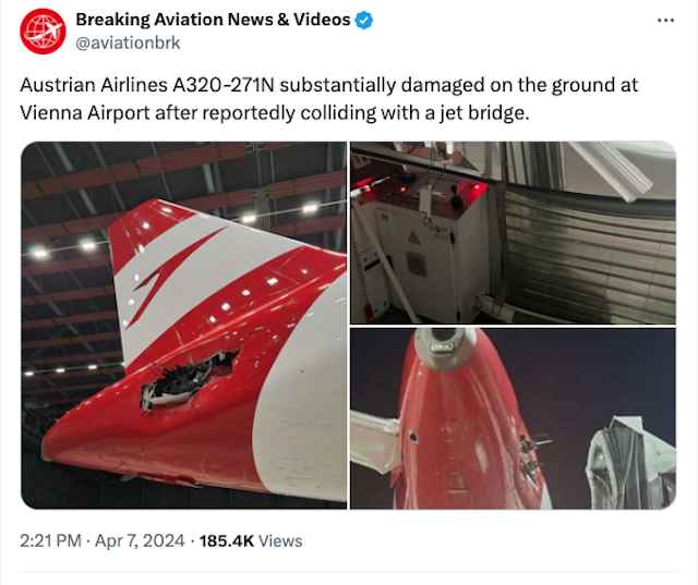 La cause de la panne est un dommage causé par une collision, début avril à l’aéroport international de Vienne, avec des structures fixes aux abords de la piste lors d’un processus de remorquage. L’avion, l’un des plus récents de la société, puisque livré en décembre de l’année dernière, a connu des dégâts importants, avec un stabilisateur horizontal droit complètement arraché.