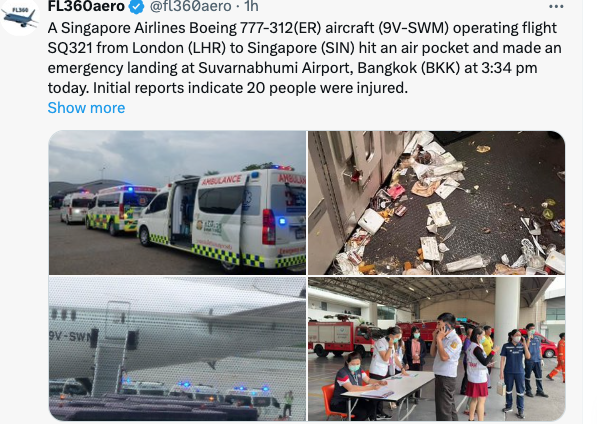 Le vol SQ321 de Singapore Airlines en provenance de Londres Heathrow a été dérouté vers Bangkok et a atterri ce mardi à 15h45, heure locale, a indiqué la compagnie aérienne. « Nous pouvons confirmer qu’il y a des blessés et un mort à bord du Boeing 777-300ER », a déclaré Singapore Airlines dans un communiqué. « Il y avait au total 211 passagers et 18 membres d’équipage à bord ». 20 passagers blessés ont été transportés à l’hôpital. La compagnie aérienne a rapporté plus tard : « Au 21 mai 2024, à 19 h 50, heure de Singapour, 18 personnes ont été hospitalisées. 12 autres sont soignées dans des hôpitaux. » Les médias thaïlandais rapportent par la suite pour la première fois qu’une deuxième personne aurait succombé à ses blessures à l’hôpital. L’information n’avait pas encore été confirmée par Singapore Airlines à l’heure d’écrire ces lignes.