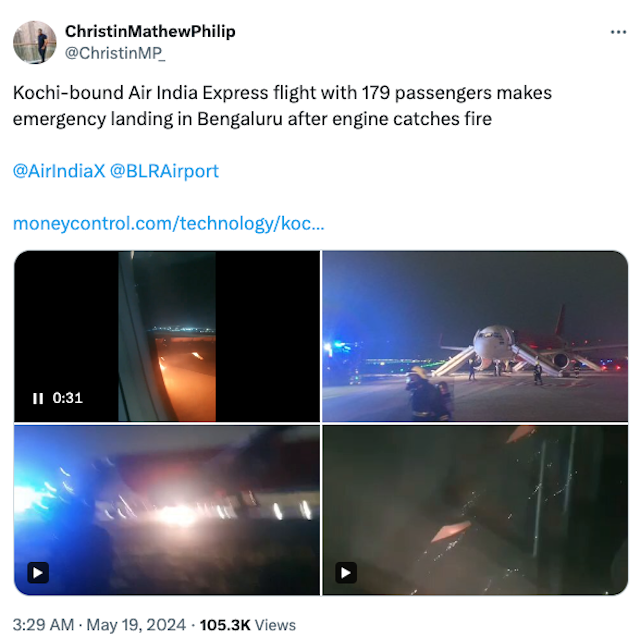 https://x.com/ChristinMP_/status/1792004722020495378?ref_src=twsrc%5Etfw%7Ctwcamp%5Etweetembed%7Ctwterm%5E1792004722020495378%7Ctwgr%5Eaef1f7c56a086a4cf9988bdc692029594f8fa58f%7Ctwcon%5Es1_&ref_url=https%3A%2F%2Fairlive.net%2Femergency%2F2024%2F05%2F21%2Fair-india-express-a320-makes-emergency-landing-in-bengaluru-after-engine-fire%2F