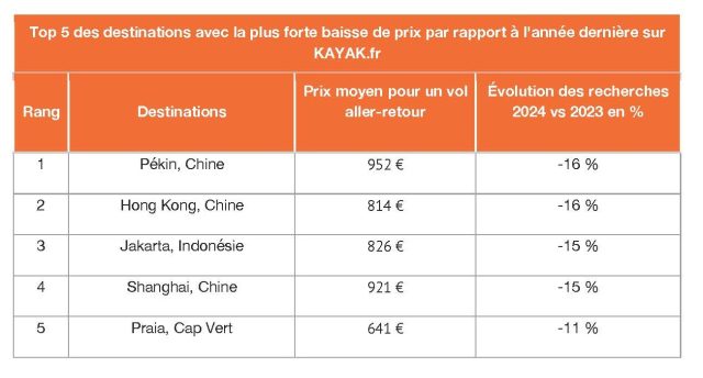 Kayak.fr dévoile également les destinations avec la plus forte baisse de prix du billet d’avion par rapport à l’année dernière selon ses données de cette année comparées à celle de l’année dernière.