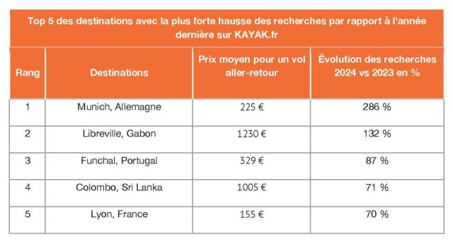 En tête du classement, Munich a connu une augmentation impressionnante de 286% des recherches, avec un prix moyen de 225 euros pour un vol aller-retour en classe économique, tandis que Lyon a connu une augmentation de 70% des recherches : “l’augmentation de Munich et de Lyon en termes de recherches de voyages s’explique par les compétitions sportives qui se dérouleront dans ces villes“, explique Kayak.fr.