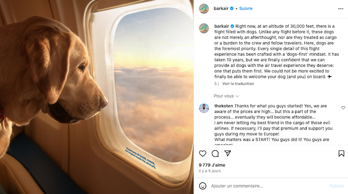 « En ce moment, à 30 000 pieds d’altitude, il y a un vol rempli de chiens. Contrairement à tous les vols précédents, ces chiens ne sont pas simplement une réflexion secondaire, ni traités comme une cargaison ou un fardeau pour l’équipage et les autres voyageurs. Ici, les chiens sont la priorité absolue », a déclaré Bark Air sur son compte Instagram. La compagnie aérienne a déclaré qu’il avait fallu 10 ans pour que le premier vol ait lieu, mais elle était convaincue qu’elle pouvait « offrir à tous les chiens l’expérience de voyage en avion qu’ils méritent : une expérience qui leur donne la priorité ».