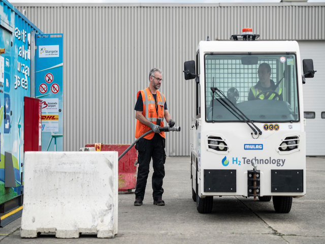 Brussels Airport et les partenaires du projet Stargate, qui s’inscrit dans le cadre du Green Deal européen, VIL et DHL, testent actuellement une station de recharge d’hydrogène et un tracteur Mulag fonctionnant à l’hydrogène à Brussels Airport.
