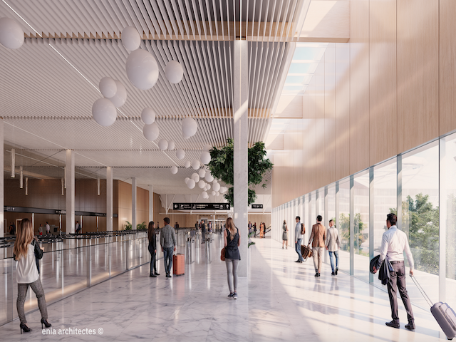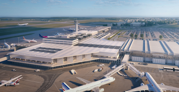 Dans une logique de modernisation, les objectifs du projet sont de fluidifier et simplifier le circuit des passagers, diminuer les temps d’attente aux différentes étapes du parcours, proposer des espaces de commerces et de divertissement inspirés des tendances de consommation des passagers et répondre aux dernières exigences réglementaires de sûreté tout en garantissant l’évolutivité des installations. Ce nouveau « processeur aéroportuaire » imaginé par le cabinet d’architecture ENIA et le bureau d’études INGEROP, propose « un parcours d’embarquement des passagers clair et efficace, basé sur une marche en avant continue, la garantie d’un processus lisible et facilité pour le passager », affirme l’aéroport dans un communiqué. « Cette opération, située dans une zone de l’aéroport déjà imperméabilisée, sera conçue et réalisée pour atteindre la certification Haute Qualité Environnementale Bâtiment Durable avec un niveau excellent. Soucieux d’inscrire pleinement cette nouvelle histoire dans la démarche de neutralité carbone compensée en 2030, l’infrastructure symbolise par son architecture sobre et sa technicité notre engagement environnementale exemplaire. »