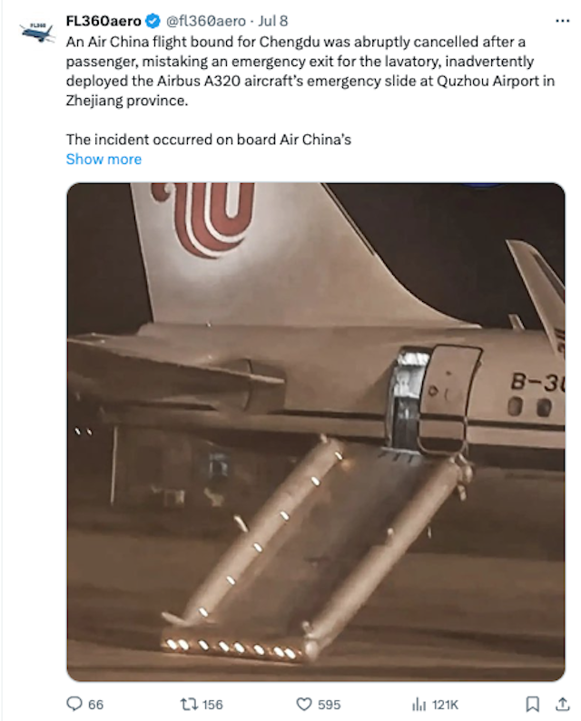 L’incident s’est produit à l’aéroport de Quzhou, dans la province du Zhejiang, sur le vol CA2754 opéré en Airbus A319 d’Air China à destination de Chengdu. Un passager a déclaré au Chongqing Morning Post : « Le vol a été retardé depuis son départ de 20h45 en raison du contrôle aérien. Vers 21h00, il semblait que personne ne se trouvait dans la zone d’opération arrière et une passagère cherchant les toilettes a ouvert par erreur la porte de secours. » « Il n’y a eu aucun bruit lorsque le toboggan s’est déployé. Après l’incident, ils ont annoncé un nouveau retard, puis ont annulé le vol. Air China nous a emmenés dans un hôtel pour nous reposer. »