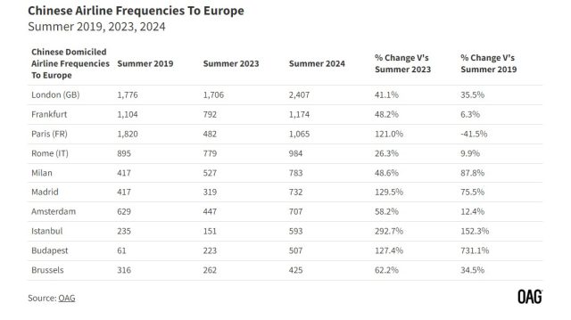 Les fréquences de vols des compagnies aériennes chinoises à l’été 2024 sont supérieures de plus de 50 % à celles de l’été 2023, selon une nouvelle analyse d’OAG (Official Aviation Guide), fournisseur de données pour l’industrie mondiale du voyage.
