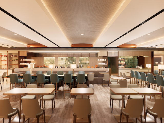 Le buffet libre-service agrandi proposera des cuisines asiatiques et occidentales. Un nouveau bar à service complet viendra compléter l’expérience culinaire, proposant du café fraîchement préparé par un barista le matin et des cocktails signature le soir.