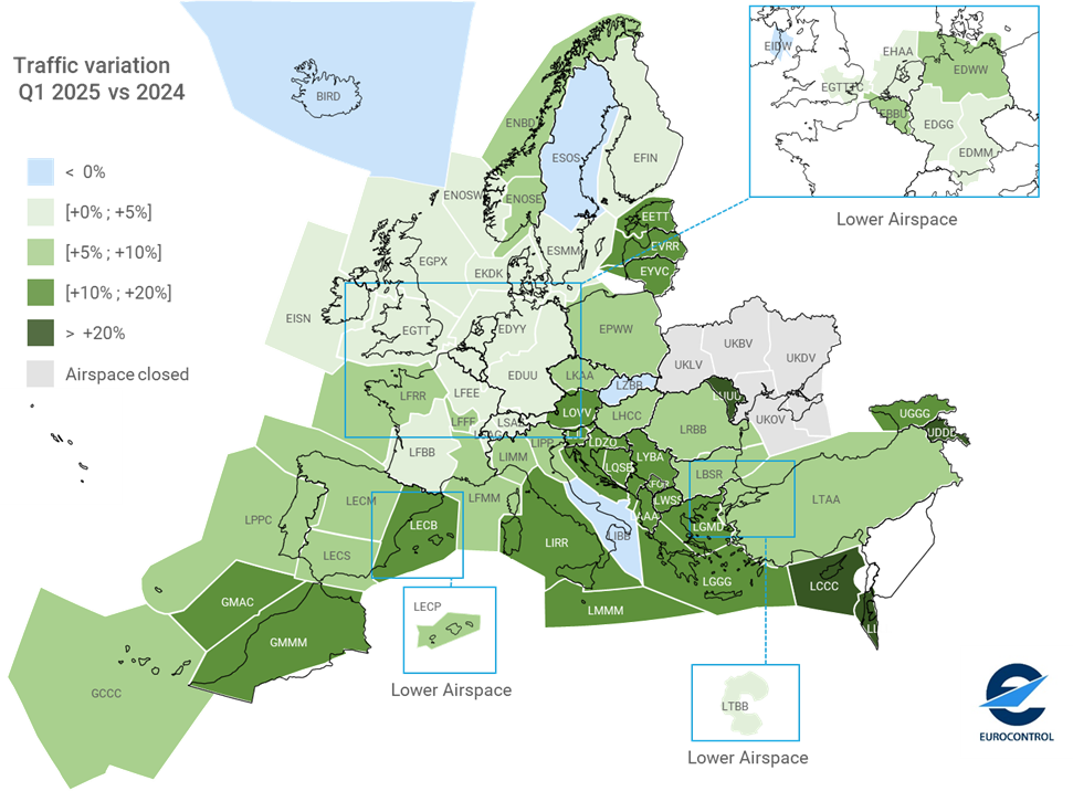 Le trafic aérien en Europe (y compris le bassin méditerranéen) a augmenté de 5 % au cours du premier trimestre 2025, par rapport à la même période de l’an dernier, selon Eurocontrol, chargé de la navigation aérienne européenne.