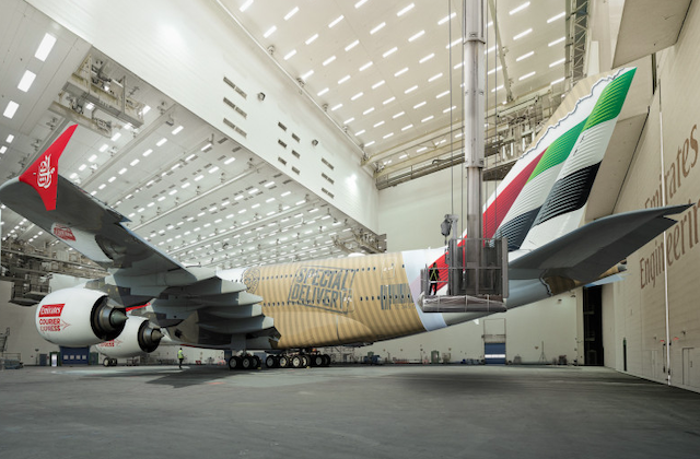 « Cette livrée saisissante, de la tête à la queue, met en valeur l’innovation de cette solution de livraison express porte-à-porte : l’intégration harmonieuse de la flotte Emirates, composée de plus de 250 gros-porteurs et de son réseau mondial à haute fréquence, avec l’infrastructure de pointe d’Emirates SkyCargo et sa maîtrise approfondie de la logistique », affirme Emirates. Il s’agit également de la première livrée inspirée du cargo sur un avion de ligne Emirates.