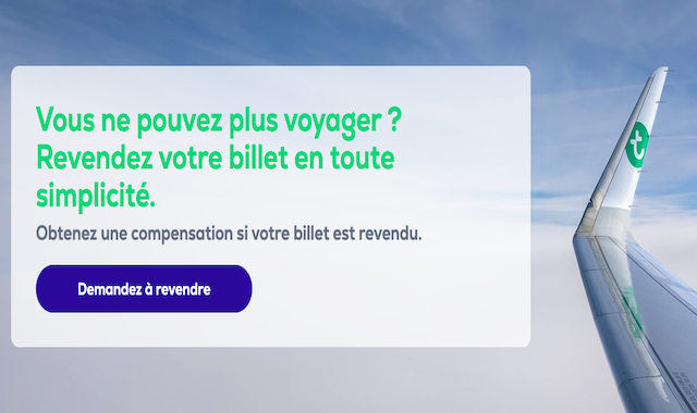 Si un client Transavia ne souhaite plus voyager, il peut se rendre sur le site transavia.com dans l’espace « Mon Transavia » et cliquer sur « Revendez votre billet ». Il peut également accéder à la plateforme en se rendant sur le site : resale.transavia.com. Son billet est alors remis à la vente et donc susceptible d’être vendu en fonction de la demande et ce, jusqu’à 1h avant le vol. Dès que son billet est racheté par un autre voyageur via le processus d’achat classique, le client recevra un remboursement d’une valeur minimale de la totalité du montant des taxes à une valeur de 50% du montant total.