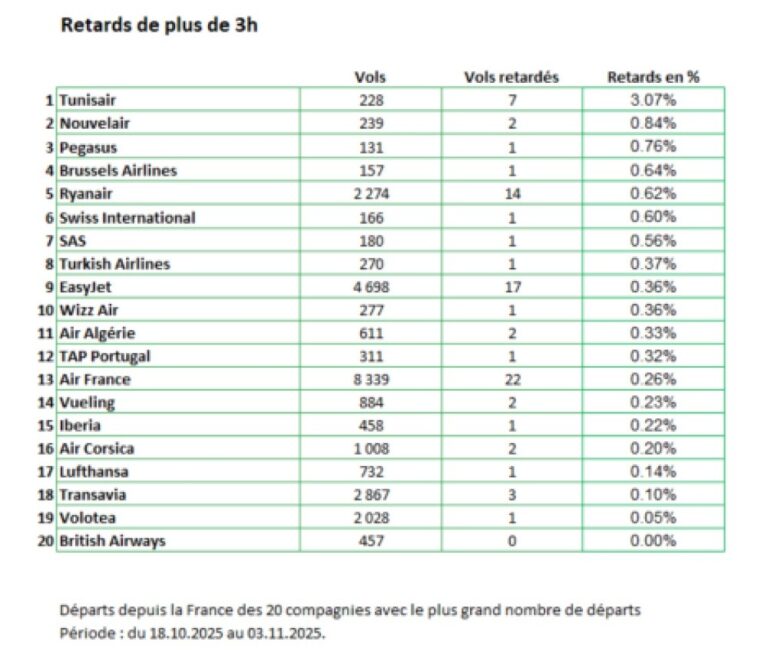 Selon Flightright, site d’aide juridique aux passagers aériens, entre le 18 octobre et le 3 novembre 2025, la compagnie aérienne tunisienne Nouvelair est la moins ponctuelle du classement avec la moitié de ses vols retardés (50,6 %, 121 vols retardés sur 239). Sur le podium, se retrouvent également TAP Air Portugal (44 %, 137 sur 311) et la low cost irlandaise Ryanair (42,9 %, 977 sur 2 274). Arrive juste derrière la low cost britannique easyJet (41,70 %, 1959 sur 4698). Et les compagnies aériennes historiques ne sont pas épargnées : Air France affiche 33,9 % de retards sur ses 8 339 vols opérés pendant les vacances de la Toussaint, tandis que British Airways atteint 36,9 % sur 457 vols.